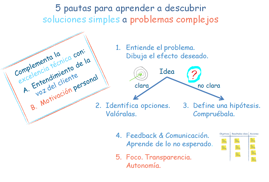 Precisamente para abordar el tema de la búsqueda de la respuesta más adecuada a un problema el método "Lean Startup" propone descubrir la solución en ciclos de aprendizaje validado. Paso a paso, terminando cada etapa con un resultado que permite al equipo entender mejor el problema que está solucionando y aprender de lo que NO ha ido según las expectativas.